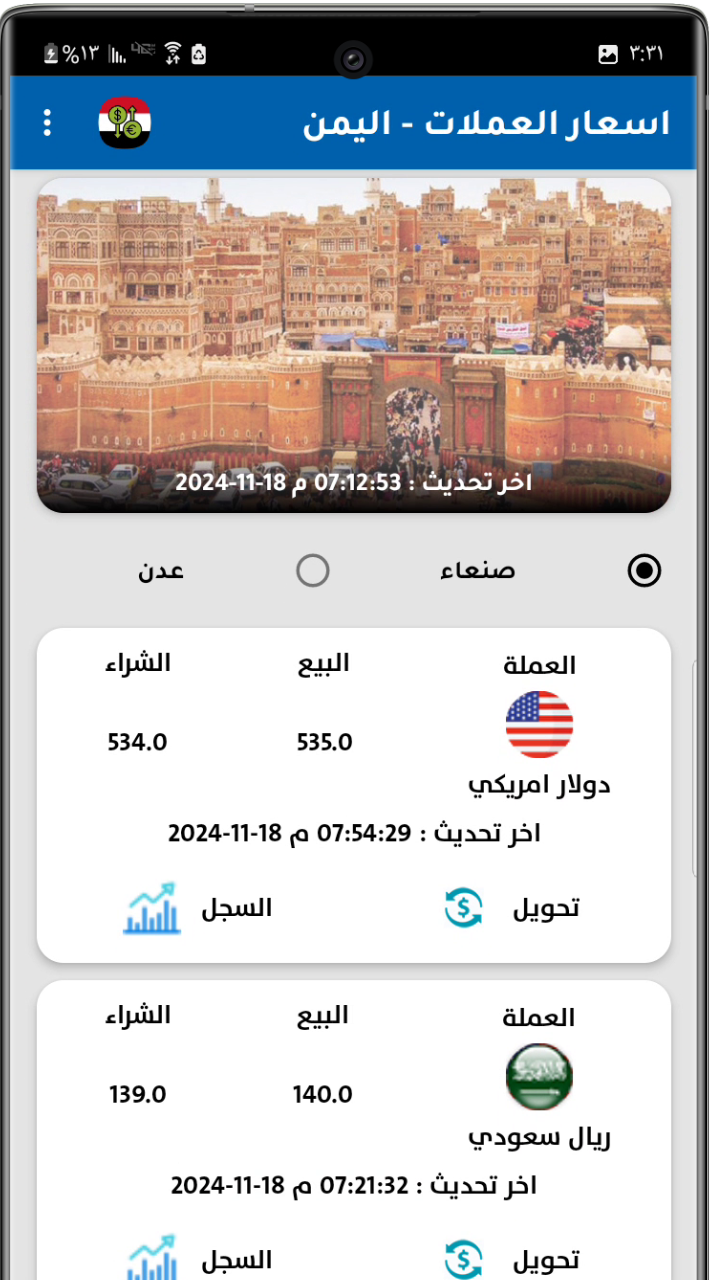 يوفر التطبيق معلومات محدثة حول أسعار العملات في السوق المحلية باليمن، مع عرض أسعار البيع والشراء بشكل دقيق. يتضمن التطبيق أسعار الريال اليمني مقابل الدولار الأمريكي والريال السعودي، مع تحديثات مستمرة لتمكين المستخدمين من متابعة التغيرات في أسعار